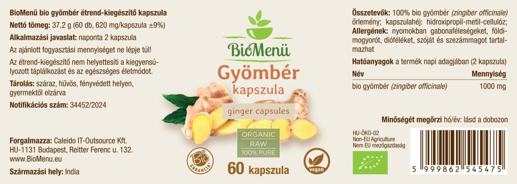 100% bio gyömbér (zingiber officinale) őrlemény; kapszulahéj: hidroxipropil-metil-cellulóz; Allergének: nyomokban gabonaféleségeket, földimogyorót, dióféléket, szóját és szezámmagot tartalmazhat