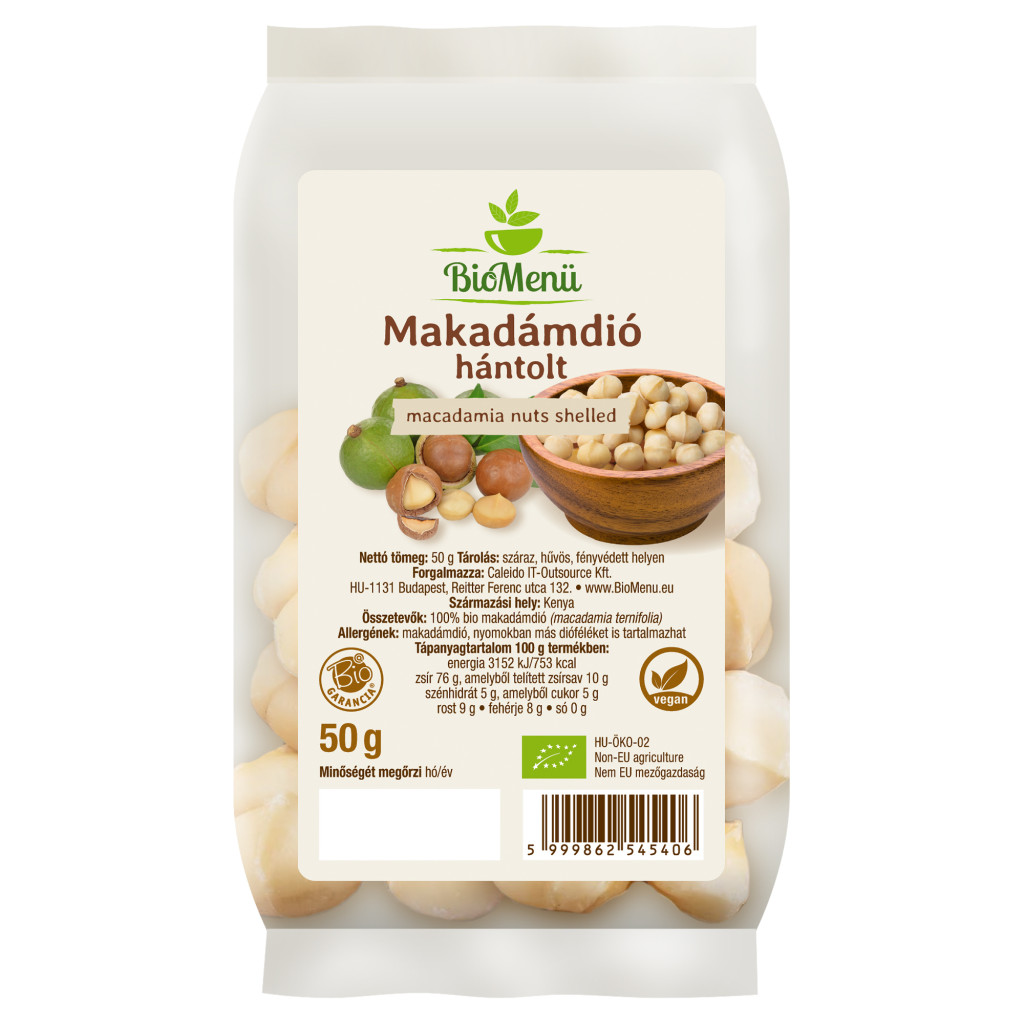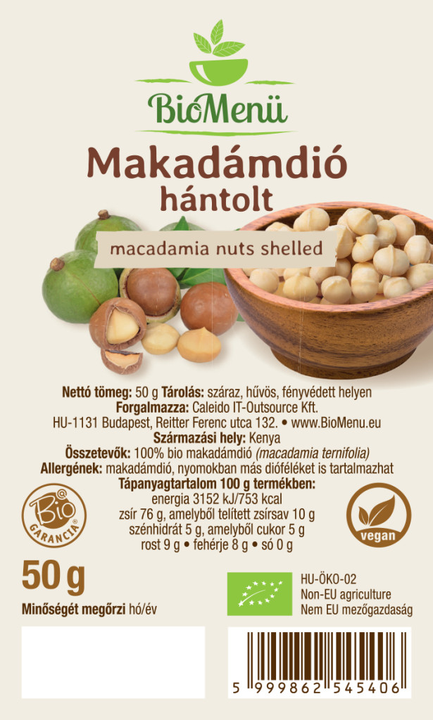 100% bio makadámdió (Macadamia ternifolia); Allergének: makadámdió, nyomokban más dióféléket is tartalmazhat