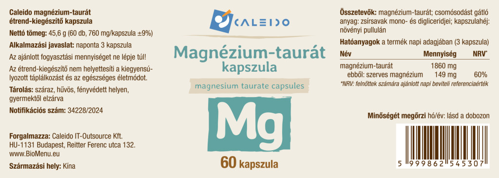 magnézium-taurát 1860 mg, ebből szerves magnézium 149 mg (NRV 60%)